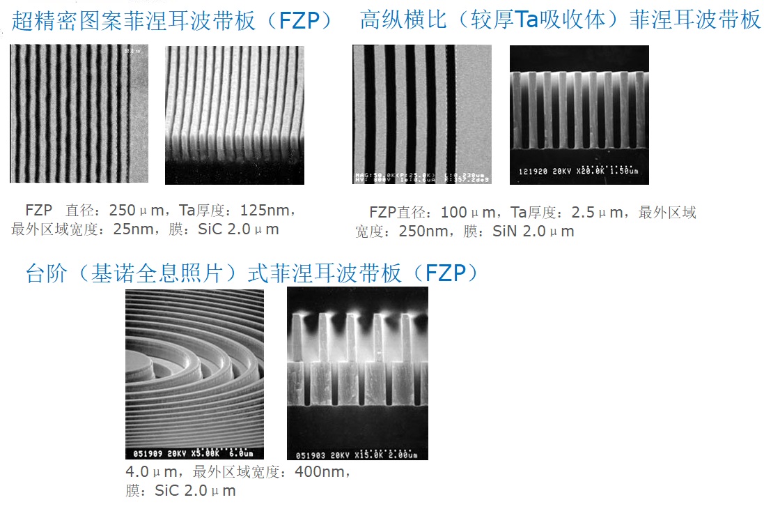 另外,还提供用于软X射线和较为紫外(EUV、XUV)领域的Ta图案/SiN膜型FZP和Au板图案/SiN 膜型FZP。并提供台阶式(基诺全息照片)FZP
