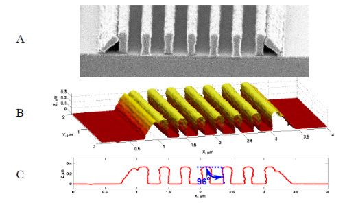 A、光刻胶致密线纹的横截面SEM图像;B、三维AFM图像;C、模板AFM轮廓线